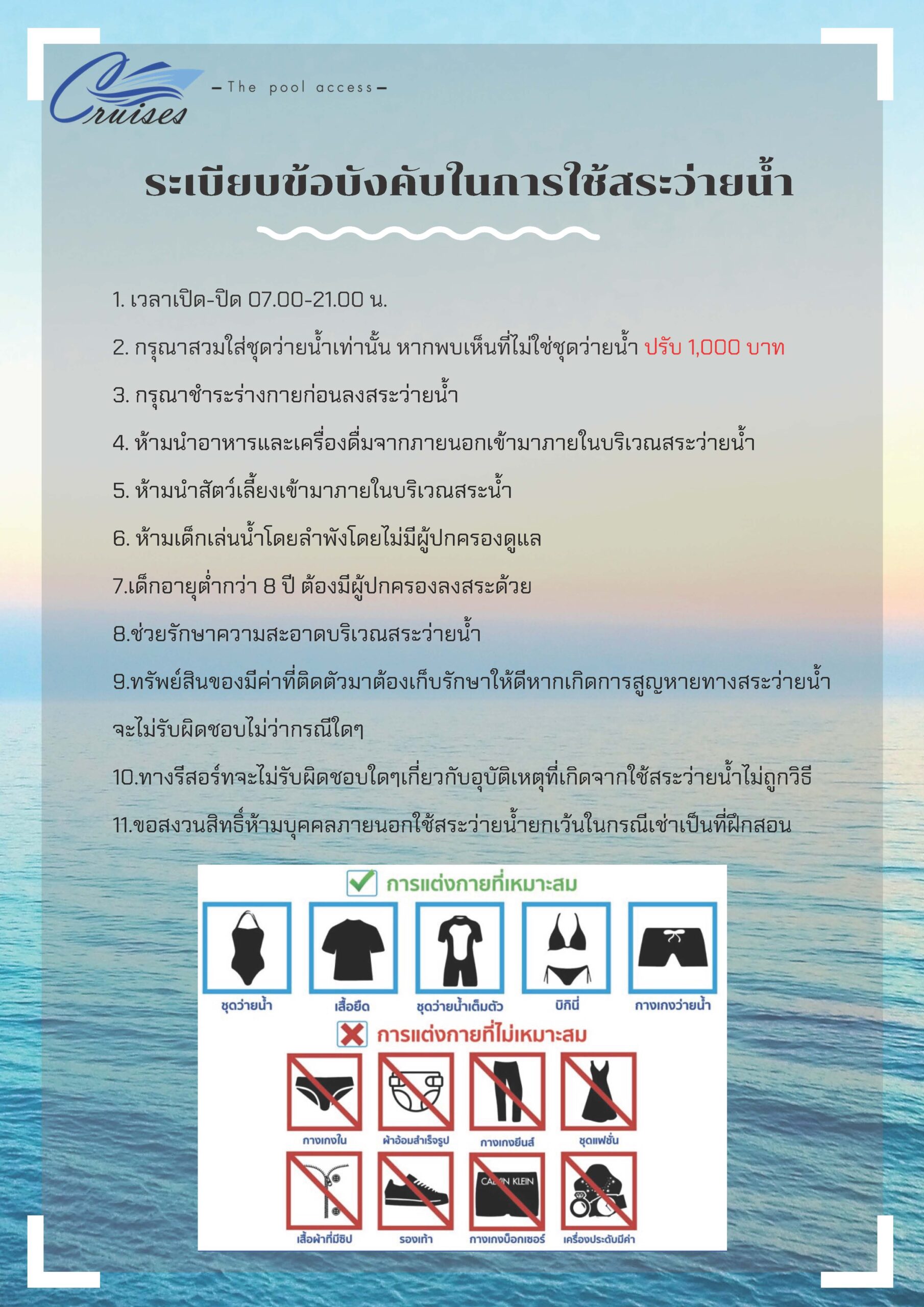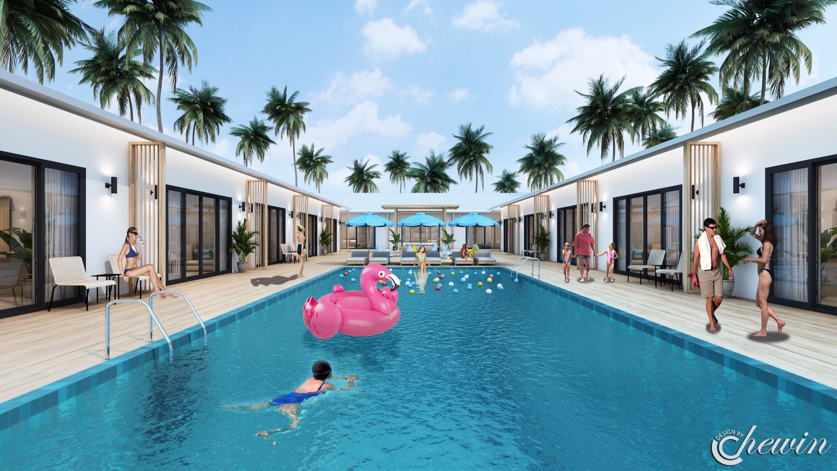 สระว่ายน้ำของเรา ตั้งอยู่บริเวณตรงกลางของห้องพักทั้งหมดในรีสอร์ต เพียงแค่คุณเดินออกมาจากห้องก็สามารถลงเล่นน้ำได้เลย แต่ก่อนที่ท่านจะลงเล่นน้ำนั้น กรุณาศึกษากฎระเบียบการใช้สระว่ายน้ำด้วยนะคะ